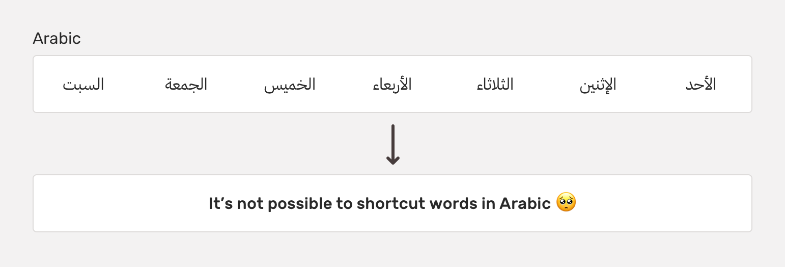 In the Arabic version, some of the words are almost the same size as their English counterparts, some are the same, and some are bigger. To make it clearer, here is a comparison of each word and its Arabic translation.